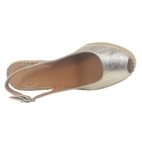 Das Modell Croacia von Toni Pons besticht durch einen 7 cm hohen Jute-Keilabsatz mit 1,5 cm Plateau. Beim Gehen fühlt sich die Absatzhöhe wie 5,5 cm an. Das Obermaterial besteht aus glattem, hellgoldenem Leder. Die Innensohle ist mit besonders komfortablem, gestepptem Leder gefüttert, die Laufsohle aus rutschfestem Gummi. Der Schuh hat eine Weite von 7,5 cm. Der Fersenriemen mit verstellbarer Schnalle sorgt für optimalen Halt.