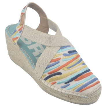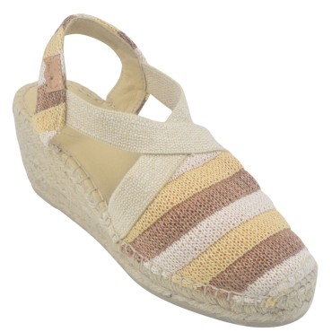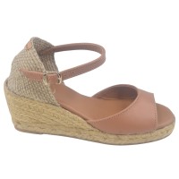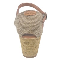 Die Sandale Llivia-P von Toni Pons besticht durch einen 6 cm hohen, mit Jute bezogenen Keilabsatz und eine 1,5 cm dicke Sohle. Die gefühlte Absatzhöhe beträgt beim Gehen 4,5 cm. Das Obermaterial ist aus glattem, hellbraunem Leder gefertigt und verfügt über einen T-Riemen mit Schnallenverschluss. Die Innensohle ist mit gestepptem Leder gefüttert, die Laufsohle besteht aus rutschfestem Gummi. Die Weite des Schuhs beträgt 7,5 cm.