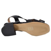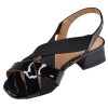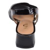 Die schwarzen Lackledersandalen, Modell 35701 der Marke Mella Italy, haben einen 3,5 cm hohen quadratischen Absatz.