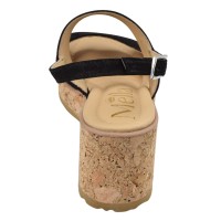 Mella Italy 1912 Keilsandalette aus schwarzem Wildleder mit verstellbarem Knöchelriemen. 6,5 cm hoher Korkabsatz, gepolsterte Lederinnensohle mit Memory-Schaum, rutschfeste Sohle. Erhältlich in den Größen 32, 33 und 34.