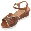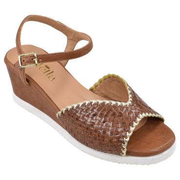 Mella Keilsandalen aus braunem Flechtleder mit 5 cm hohem, lederbezogenem Absatz, gepolsterter Lederinnensohle und ultraleichter Mikrofasersohle. Elegant und bequem, erhältlich in den Größen 33 und 34.