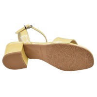 Mella 1131 Sandalen aus elegantem, leuchtend zitronengelbem Lackleder. Stabiler 4 cm Absatz und 7 cm Weite, ideal für schmale Füße und Knöchel. Hergestellt in Spanien.