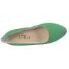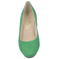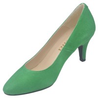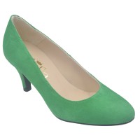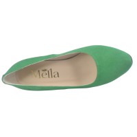Das Modell Niza der Marke Mella ist auf einem stabilen Absatz mit einer Höhe von 7 cm montiert. Seine Spitze ist rund geformt. Die Schuhweite beträgt 7,5 cm (Standardweite). Sein Obermaterial besteht aus grasgrünem Wildleder und seine Ferse ist mit Wildleder überzogen. Die Innensohle besteht aus Leder und die Laufsohle aus hochwertigem Elastomer.