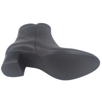 El tacón mide 4,5 cm y es de color negro, con un efecto madera natural. La caña mide 12 cm (medida en la parte más ancha de la pantorrilla). La circunferencia del tobillo mide 25 cm (medida en la parte más ancha de la pantorrilla). Un cierre de cremallera en el exterior facilita su colocación.