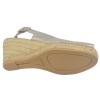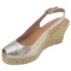 El modelo Croacia de Toni Pons presenta una cuña de yute de 7 cm y una plataforma de 1,5 cm. La altura del tacón es de 5,5 cm al caminar. La parte superior es de piel lisa en dorado claro. La plantilla está forrada con piel acolchada ultracómoda y la suela es de goma antideslizante. El zapato tiene un ancho de 7,5 cm. La tira trasera tiene un cierre de hebilla ajustable para un ajuste perfecto.