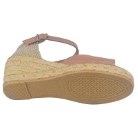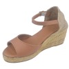 La sandalia Llivia-P de Toni Pons presenta un tacón de cuña de 6 cm recubierto de yute y una suela de 1,5 cm de grosor. El tacón se siente a 4,5 cm de altura al caminar. El empeine es de piel lisa marrón claro con tira en T y cierre de hebilla. La plantilla está forrada de piel acolchada y la suela es de goma antideslizante. El ancho del zapato es de 7,5 cm.