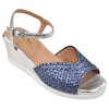 Sandalias de cuña Mella 35749 de piel trenzada azul con tacón de cuña de 5 cm forrado en piel plateada. Plantilla de piel acolchada y suela de microfibra ultraligera. Disponibles en tallas pequeñas 33 y 34.