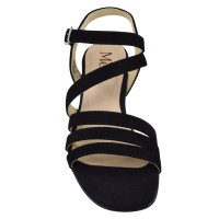Sandalias Mella 1235 en ante negro, con tacón forrado de 6 cm. Ancho de 7 cm, ideal para pies estrechos y empeine bajo. Tira diagonal con discreto elástico interior para un mejor ajuste. Disponibles en tallas 33 y 34. También disponible en rojo.