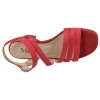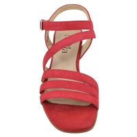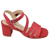 Sandalias Mella 1235 de ante rojo con tacón forrado de 6 cm de ancho. 7 cm de ancho, especialmente diseñadas para pies estrechos y empeine bajo. Tira diagonal con elástico interior para un ajuste cómodo. Disponibles en tallas 33 y 34.