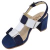 Sandalias Mella 1246 en ante azul marino y azul eléctrico, con tacón de 6 cm de ancho revestido de ante. Paneles cuadrados de piel blanca y plateada unidos a una discreta base transparente. El ancho de 7,5 cm es adecuado para pies estrechos y estándar. Disponibles en tallas 33 y 34.