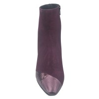 Sa tige est composée de daim bordeaux et un jeu de cuirs à l'avant de la bottine composé de cuir luisant bordeaux et cuir vipérine brillant bordeaux.