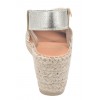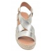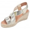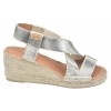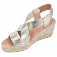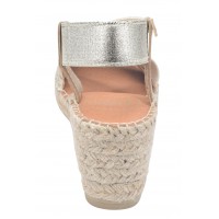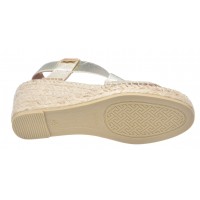 Le modèle Tura-RC de la marque Toni Pons est monté sur un talon compensé enrobé de jute d'une hauteur de 6 cm comprenant une semelle épaisse en juste de 1.5 cm. Vous aurez un ressenti à la marche de 4.5 cm de hauteur. Sa tige est faite d'une jeu de bandes élastiques dorées passant du cou de pied à l'arrière du talon. La semelle intérieure est recouverte de cuir avec une couche matelassée, la semelle extérieur est en caoutchouc antidérapant. La largeur de son chaussant est de 7.5 cm.