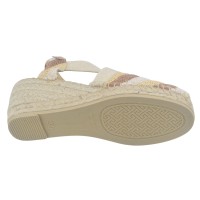 Espadrilles à talon compensé, tricolores ecru, nude et marron.