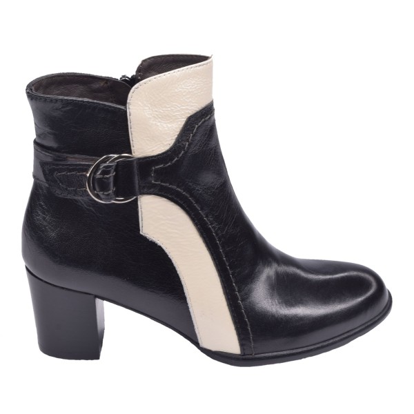 Its upper is made of black smooth leather and beige patent crackle leather with a decorative buckle on the outer side. The insole is lined with high quality calfskin. Its rod is 11.5 cm and its calf contour (taken at the top of the rod on a size 34) is 24 cm. These women's ankle boots in small sizes are easy to put on with a side zipper on the inside of the boot. The width of his footwear is 7.5 cm (standard width). Its tip is round.