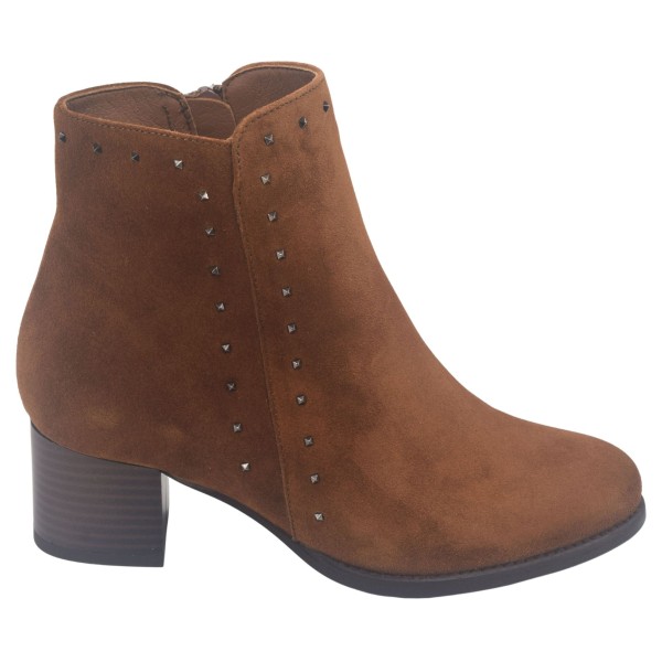 These are the taupe suede leather ankle boots, reference 245442 from the Piesanto brand, to have in your wardrobe. A classic, with a heel height of 4.5 cm, with a touch of originality and elegance thanks to its upper decorated with small discreet and stylized square studs at the same time . The top of its upper, at 11.5 cm, forms a pretty shape on the top of your ankle; you can consider showing the top of these pretty small size ankle boots (33 or 34) with a dress or short pants.