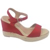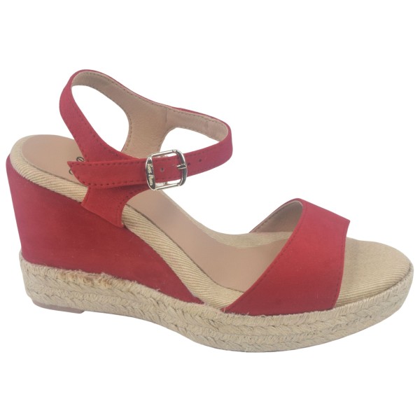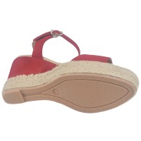The Agnes-A wedge sandals by Toni Pons feature a heel wrapped in red suede leather at the top and a jute sole. The heel is 6 cm of suede and 2 cm of jute, for a total height of 8 cm. The upper is made of red suede leather. The outsole is natural rubber, and the insole is lined with beige natural canvas and a leather insole for added comfort.