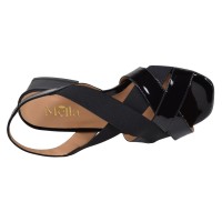 The black patent leather sandals, 35701 from the brand Mella Italy, are mounted on a 3.5 cm square heel.