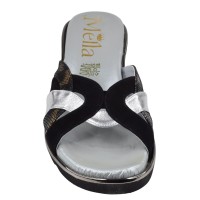 Mella Italy wedge mule in black suede, silver leather, and black and bronze viperine-effect leather. Ultra-lightweight 3.5 cm wedge heel, leather insole. Available in small sizes 32, 33, and 34.