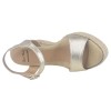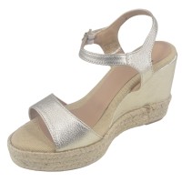 I sandali con zeppa Agnes-P della marca Toni Pons sono montati su un tacco rivestito in pelle liscia dorata sulla parte superiore del tacco e su una suola di iuta. Il tacco è composto da 6 cm di pelle bronzo e 2 cm di iuta per un'altezza totale del tacco di 8 cm. La tomaia è in pelle liscia color oro, la suola è in gomma naturale e il sottopiede è rivestito in tela beige naturale e suola in cuoio per garantire un miglior comfort.