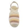 Il modello Terra-AB di Toni Pons presenta una zeppa in juta di 6 cm con una suola spessa 2 cm. Questo dà l'impressione di un tacco di 4 cm quando si cammina. La tomaia è realizzata in cotone lavorato all'uncinetto in tre colori: ecru, nude e marrone. Un'ampia fascia elastica beige, non costrittiva, fissata in diagonale, consente l'elasticità sia in lunghezza che in larghezza, garantendo una calzata confortevole e un sostegno ottimale.