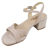 Sandali Mella, modello 1232-5, in camoscio beige, con tacco rivestito di 4,5 cm. Larghezza 7,5 cm (adatto a piedi stretti e standard). Eleganti e comodi, disponibili nelle taglie 33 e 34. Disponibili anche in camoscio nero.