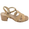 Sandali Mella 1144 in camoscio cammello con tacco effetto legno naturale di 4 cm. Larghezza 7,5 cm, adatti a piedi stretti e standard. Soletta in pelle e suola in elastomero antiscivolo.