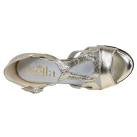 Sandálias de festa Mella Italy, modelo 2489, em couro dourado metálico com glitter tom sobre tom. Salto de 7 cm, largura de 7,5 cm, palmilha macia para maior conforto. Ideais para casamentos e ocasiões formais. Disponíveis nos tamanhos 32, 33 e 34. Também disponíveis na cor prata.