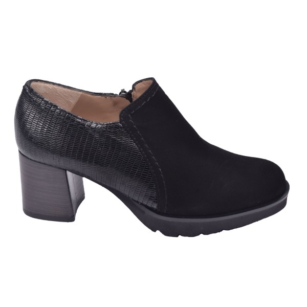 Botas baixas bimatéria, camurça preta e couro viperino preto, 4078, Plumers, com salto de 5,5 cm de altura.