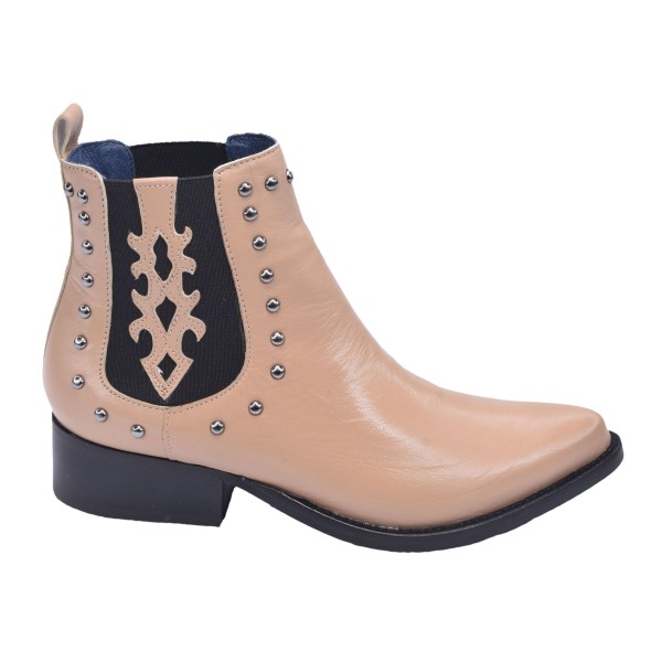 As botas estilo Hyppas Chelsea da marca Pierre Cardin são montadas sobre um salto quadrado preto natural de 3,5 cm. A parte superior é feita de couro nude liso adornado com pequenos botões de prata. A palmilha é de couro com calçado de 7 cm de largura (para pés finos). Sua sola é feita de elastômero de alta qualidade.