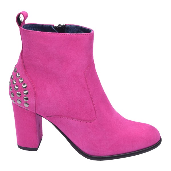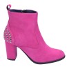 Os botins Halbi da marca Pierre Cardin são montados sobre um lindo salto de 7 cm revestido em couro camurça rosa fusha. A parte superior é feita de couro camurça rosa fúcsia. As costas são adornadas com pequenos tachas de prata. A palmilha é de couro com calçado de 7 cm de largura (para pés finos).