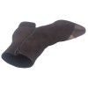Seu cabedal é feito de camurça marrom e um conjunto de couros na parte da frente da bota é feito de couro marrom brilhante e couro viperine bronze brilhante.