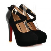 Bombas, preto, look camurça, alças, com salto de 12 cm de altura e plataforma frontal de 3 cm.