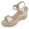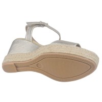 As sandálias de cunha Agnes-P da marca Toni Pons têm salto revestido em couro liso dourado na parte superior do salto e sola de juta. O salto é composto por 6 cm de couro bronze e 2 cm de juta, totalizando 8 cm de altura do salto. O cabedal é em couro liso dourado, a sola é em borracha natural e a palmilha é forrada em lona bege natural e sola em couro para maior conforto.