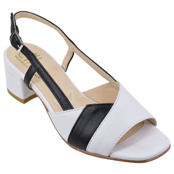 As sandálias Ellen – modelo 433 – impressionam pelo seu design elegante e contrastante, combinando subtilmente couro branco e preto para um estilo intemporal e refinado.